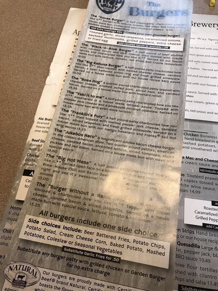 6oz patty topped with lettuce, tomato, red onion, pickle chips, peppered bacon, and American cheese, topped with Hop Sauce. Served with a side.